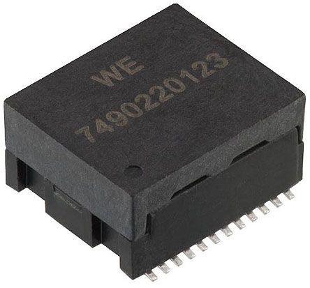 This is Surface Mount Lan Ethernet Transformer manufactured by Wurth Elektronik. The manufacturer part number is 7490220123. The product has +85°c maximum temperature. The product complies with all safety standards, such as dap black per ul 94 v-0, iee 802.3bt, ieee 802.3ab, ieee 802.3af, ieee 802.3at, ieee 802.3u. The product is available in surface mount configuration. While its minimum temperature is -40°c. Moreover, it has 1 output ports . 1400ma is the secondary current rating of the product . Furthermore, the product is 14.7mm wide. Its accurate length is 18.29mm. The product has been well-designed with enclosed construction. It has 1:1 turns ratio . Allows -1db of insertion loss.
