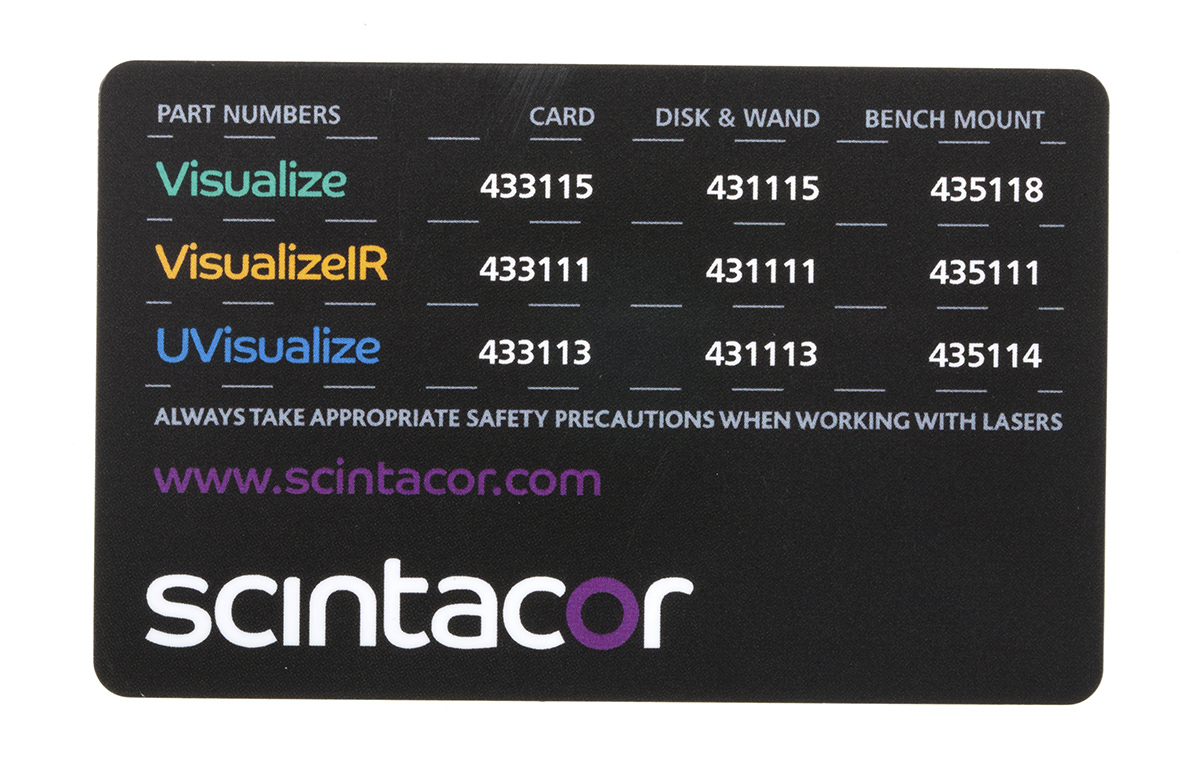 This is Visualize IR Series IR Laser Alignment Card manufactured by Scintacor. The manufacturer part number is 433111. The product visualize ir, is a highly preferred choice for users. The given dimensions of the product include 86 x 54mm.