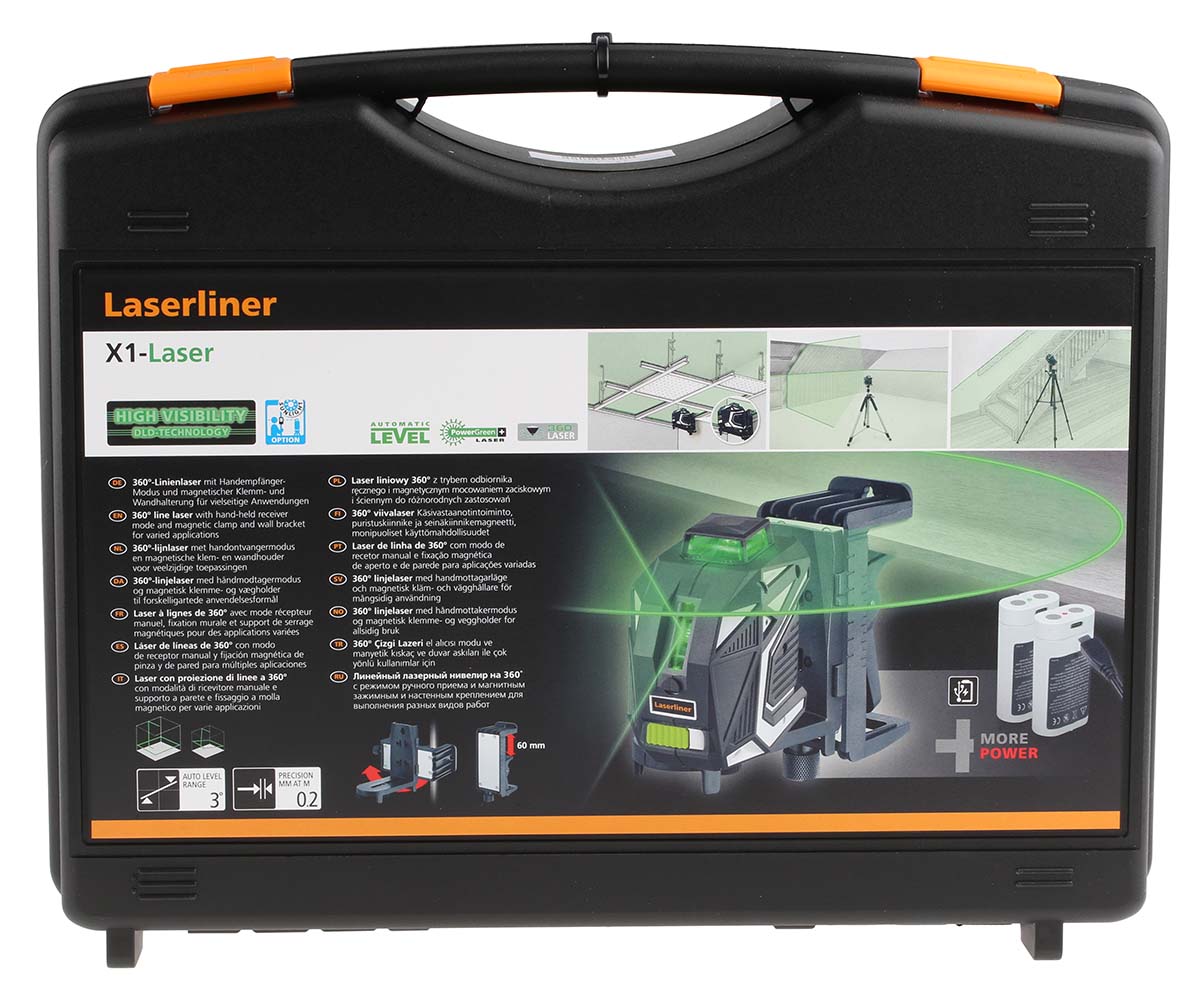 This is X1 Laser Pro line level manufactured by Laserliner. The manufacturer part number is 031.500L. The given dimensions of the product include 122 x 121 x 75mm. It has a self levelling feature yes . It is suitable for indoor working environment . It has a standard ±0.2mm/m levelling accuracy . In addition, the height is 75mm. Furthermore, the product is 121mm wide. Its accurate length is 122mm. The Number of Laser Dots Included in the product 0 It is offered with a/an green colour laser . This li-ion battery is comparatively much efficient than common batteries. Its laser class is class 2 . It has an alignment level feature yes . Moreover, it has 2 laser lines .