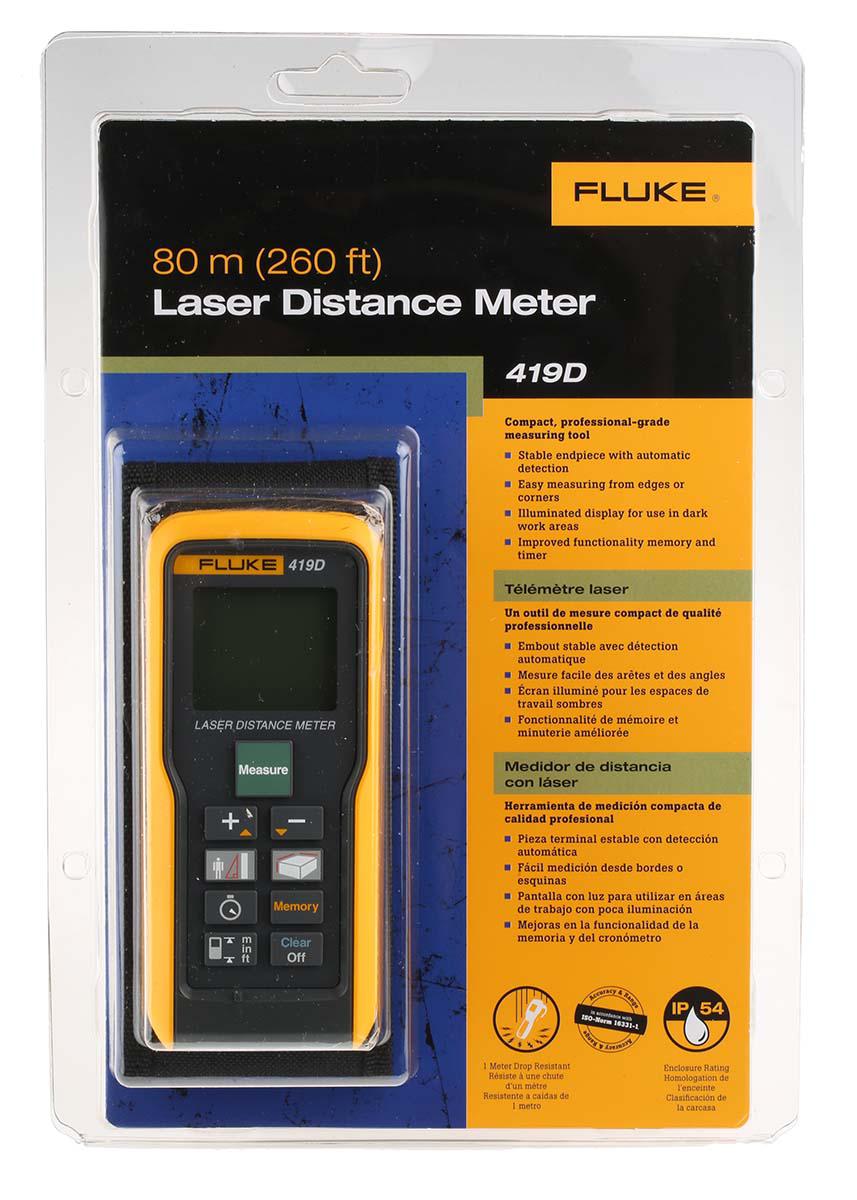 This is 419D Distance Meter 80 m manufactured by Fluke. The manufacturer part number is Fluke-419D. It is available in imperial, metric package. It features a remarkable lcd display. The typical product's weight is 153g. Moreover, the product gets power from battery. Its measurement range is 80m . While it has 419d of model number. It has about 635nm laser wavelength . Its laser class is class 2 . It provides high accuracy of ±2 mm.