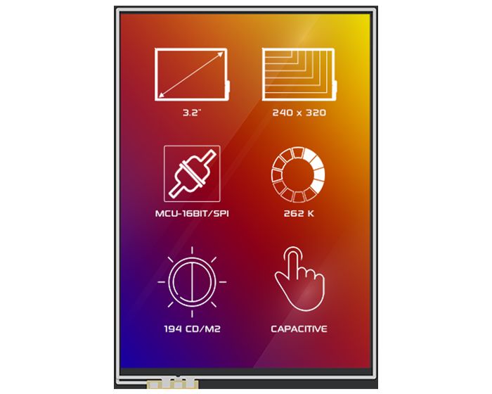 This is 3.2in.240x320pixelcolour LCD ModCTouch manufactured by 4D Systems. The manufacturer part number is 4DLCD-32320240-CTP. Its contrast ratio is 250:1 . 240 x 320 pixel is the Screen Resolution of the product Features a 25ma current in A. Furthermore, the product is 55.04 mm wide. The product requires a maximum 3.3v supply voltage . It has about 81.28mm diagonal display size . It has a minimum 2.6v supply voltage . Moreover, it has a/an led type backlight . lcd colour display is a versatile product designed to provide user-defined applications. It has a maximum operating temperature of 70°c. The product includes a power supply no . It has about 190cd/m² brightness . The product comes in 64.80mm depth. It is a type of mcu 16 bit/spi interface. Touch screen included yes . It has approximately 48.6 x 64.8 mm viewing area dimensions . It features a remarkable lcd display. It includes a touch screen of capacitive type . The product 4dlcd, is a highly preferred choice for users. In addition, the height is 77.7mm. Whereas, the minimum operating temperature of the product is -20°c.