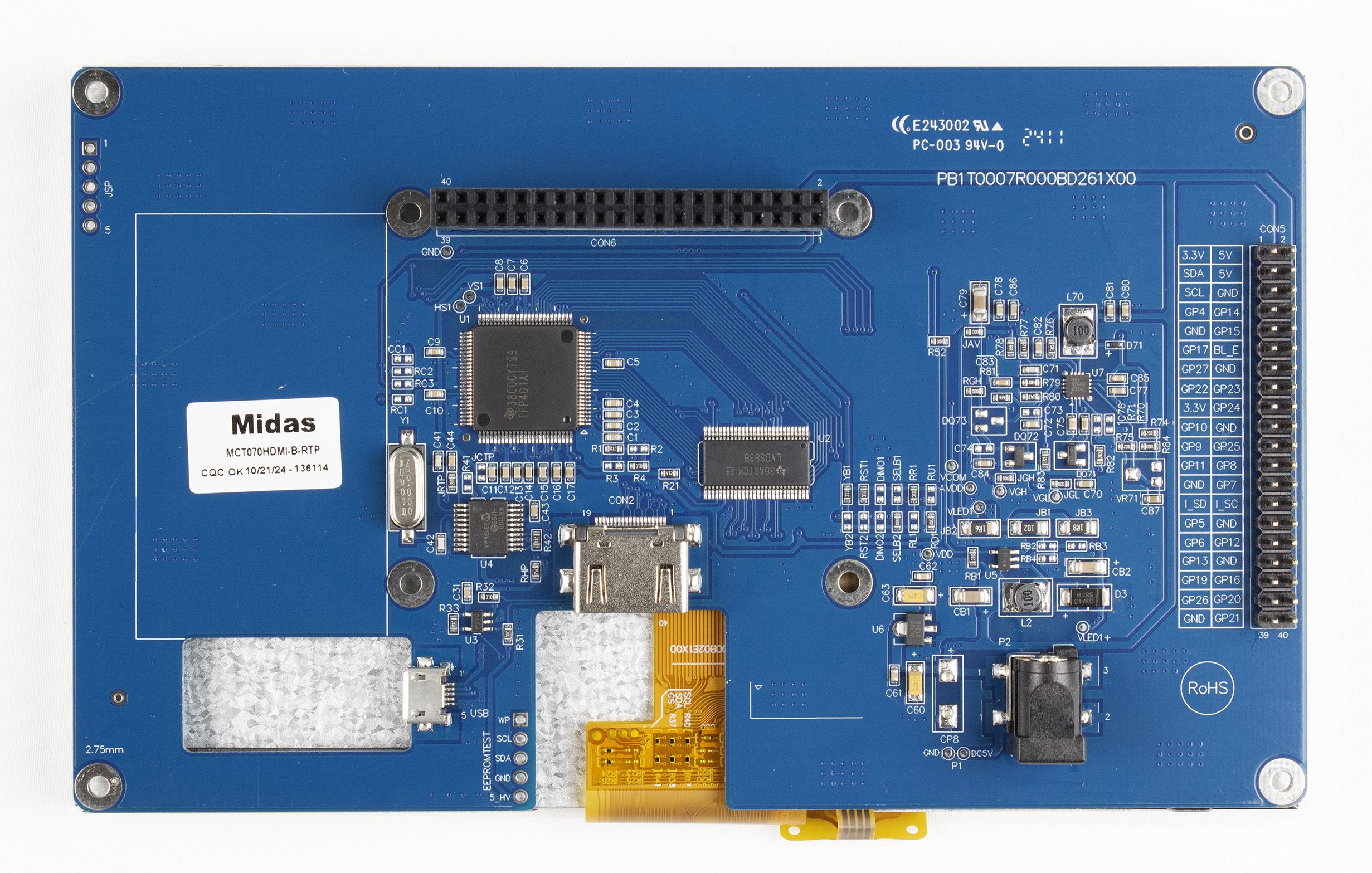This is TFT LCD Colour Display / Touch Screen 7in 1024 x 768pixels manufactured by Midas. The manufacturer part number is MDT0700ESSR-HDMI. The given dimensions of the product include 165.0 x 99.8 x 26.3mm. It has about 400cd/m² brightness . It includes a touch screen of resistive type . It has approximately 154.2144 x 85.92mm viewing area dimensions . It is designed using tft display matrix technology . Moreover, it has a/an led type backlight . It is a type of hdmi interface. Whereas, the minimum operating temperature of the product is -20°c. Touch screen included yes . It has a maximum operating temperature of +70°c. Features 1024 x 600pixels resolution. It has about 7in diagonal display size .
