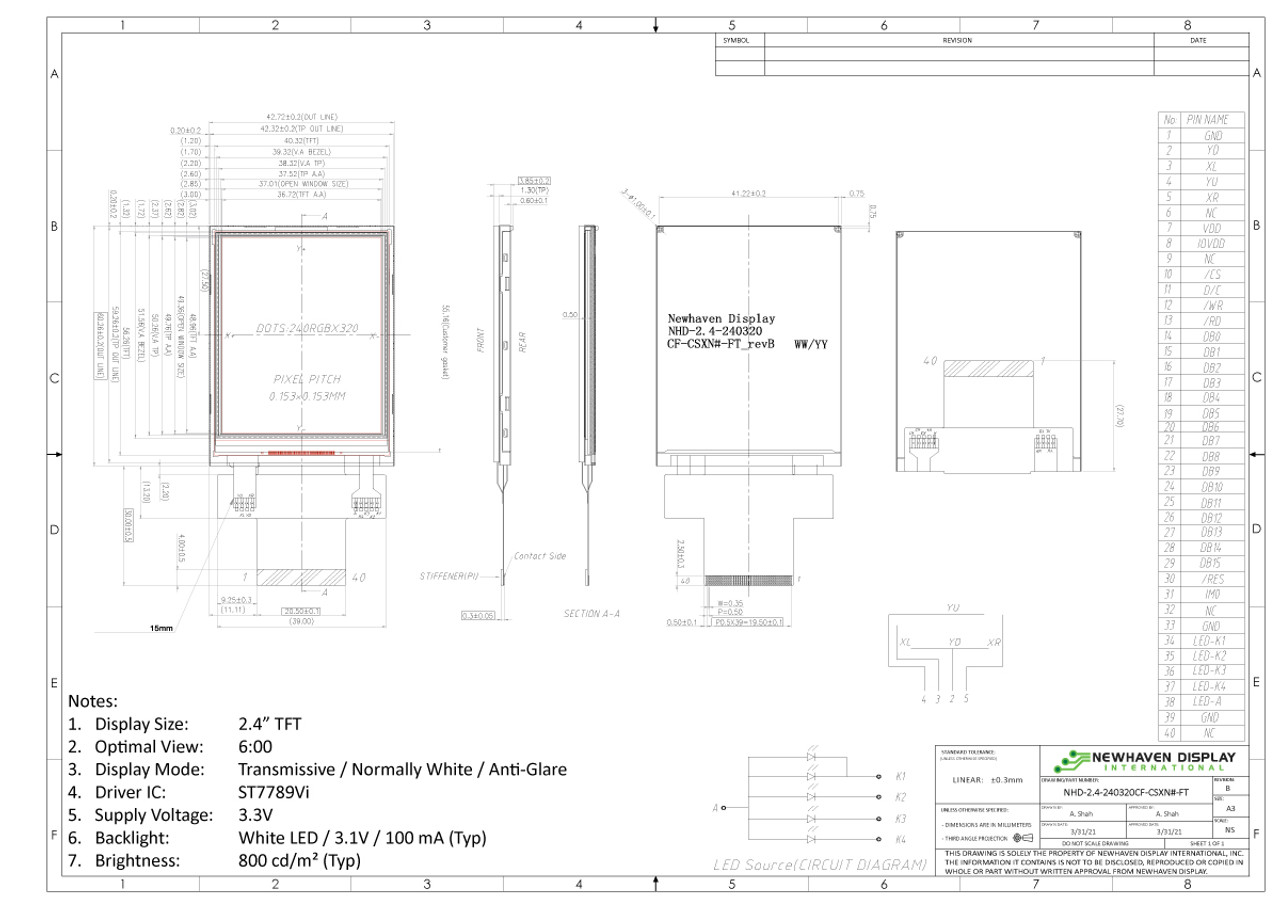 This is TFT LCD Colour Display / Touch Screen 2.4in 240x320pixels manufactured by NEWHAVEN DISPLAY INTERNATIONAL. The manufacturer part number is NHD-2.4-240320CF-CSXN#-F. It features a remarkable lcd tft display. The given dimensions of the product include 42.32 x 59.91 x 3.0mm. It has about 800cd/m² brightness . It includes a touch screen of resistive type . The product nhd, is a highly preferred choice for users. Touch screen included yes . It is designed using tft display matrix technology . It has approximately 37.72 x 49.96mm viewing area dimensions . It is a type of parallel interface. Whereas, the minimum operating temperature of the product is -20°c. Typically has a transmissive display mode. It has about 2.4in diagonal display size . Features 240x320pixels resolution. It has a maximum operating temperature of +70°c. Features 3.3 v supply voltage.