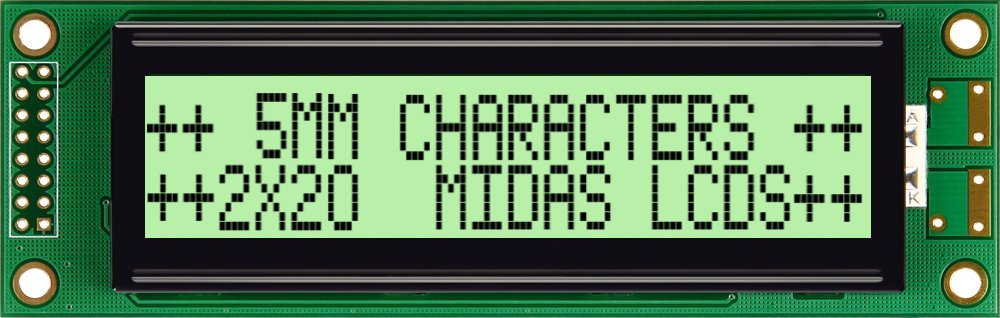 This is MC22005A6W Alphanumeric LCD Display Black on Yellow/Green 2 Rows by 20 Characters manufactured by Midas. The manufacturer part number is MC22005A6W-GPTLY-V2. It is designed with an attractive yellow/green colour background . It features a remarkable alphanumeric display. It is designed with a/an black colour illumination . The product mc22005a6w, is a highly preferred choice for users. It contains 2 rows by 20 characters matrix character . It has a standard 5.6mm character in height . Additionally, it has 20 characters per row . In addition, it has about 3.2mm character width . Typically has a transflective display mode. The product contains 2 character rows .