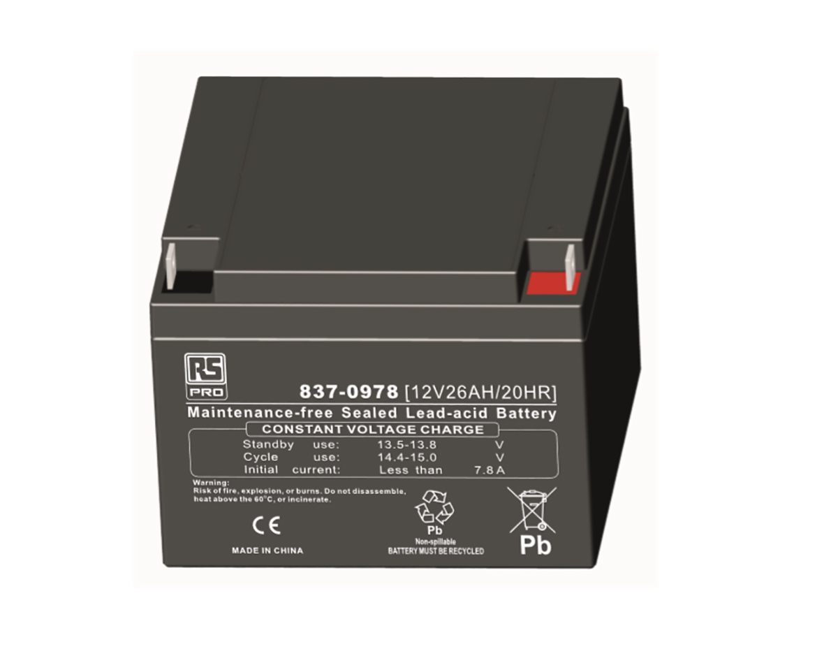 This is RS26-12 12V Lead Acid Battery 26Ah manufactured by RS Pro. The manufacturer part number is 837-0978. It has a 3 to 5 years eurobat classification . It is specifically designed for high rate application no . The module has the capacity of 26ah. The given dimensions of the product include 166 x 175 x 125mm. The typical product's weight is 9.4kg. The product has -20 → +55°c of operating temperature range. Whereas, it has a flame resistant feature no . Applications Information involves cyclic. The product has been well-designed with agm construction. Moreover, it is designed for cyclic application yes . Whereas, the minimum operating temperature of the product is - 20°c. The nominal voltage of the product is 12v. It has a/an lead acid chemistry . It has a maximum operating temperature of + 55°c. The terminal is a t3 type. Its brand range is rs pro .