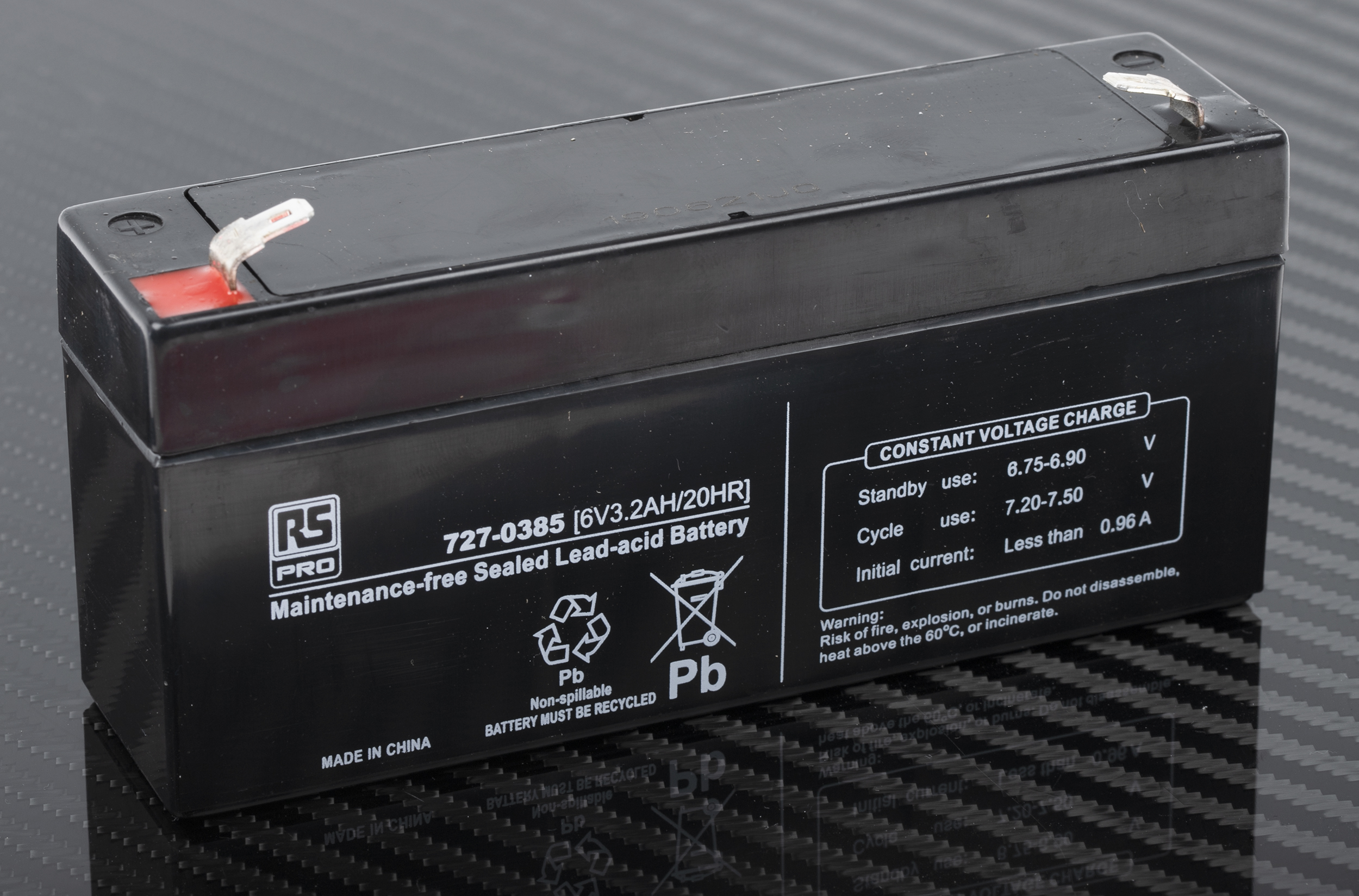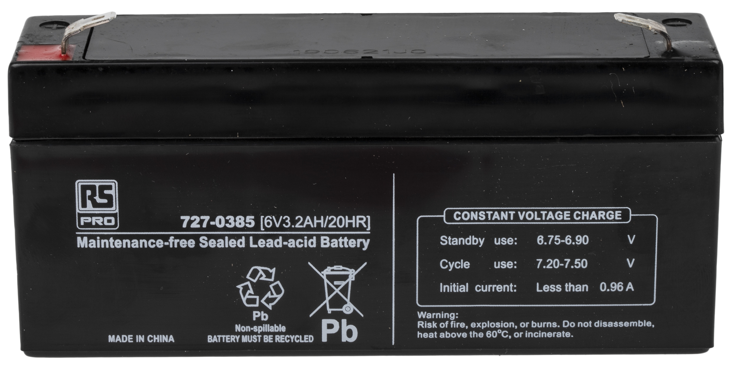 This is RS3.2-6 6V Lead Acid Battery 3.2Ah manufactured by RS Pro. The manufacturer part number is 727-0385. It has a 3 to 5 years eurobat classification . It is specifically designed for high rate application no . The module has the capacity of 3.2ah. The given dimensions of the product include 134 x 34 x 60mm. The typical product's weight is 670g. The product has -20 → +50°c of operating temperature range. Whereas, it has a flame resistant feature no . Applications Information involves stand by use. The product has been well-designed with agm construction. Moreover, it is designed for cyclic application no . Whereas, the minimum operating temperature of the product is - 20°c. The nominal voltage of the product is 6v. It has a/an lead acid chemistry . It has a maximum operating temperature of + 50°c. The terminal is a t1 type. Its brand range is rs pro .