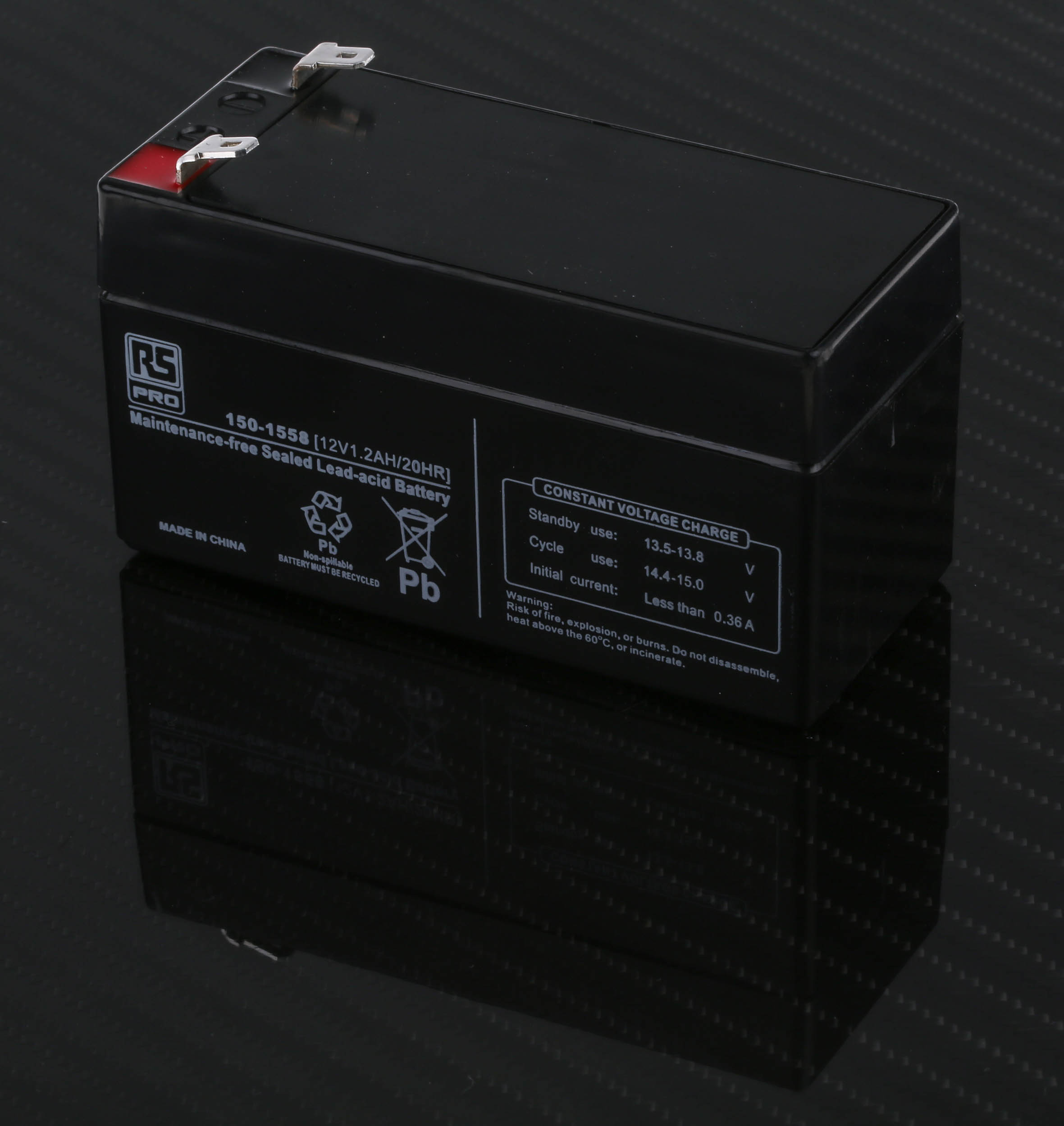 This is Lead Acid Rechargeable Battery - 12V 1.2Ah manufactured by RS Pro. The manufacturer part number is 150-1558. It has a 3 to 5 years eurobat classification . It is specifically designed for high rate application no . The module has the capacity of 1.2ah. The given dimensions of the product include 97 x 43 x 52mm. The typical product's weight is 570g. The product has -15 → +50°c of operating temperature range. Whereas, it has a flame resistant feature yes . Applications Information involves stand by use. The product has been well-designed with agm construction. Moreover, it is designed for cyclic application no . The nominal voltage of the product is 12v. It has a/an lead acid chemistry . The terminal is a t1 type.