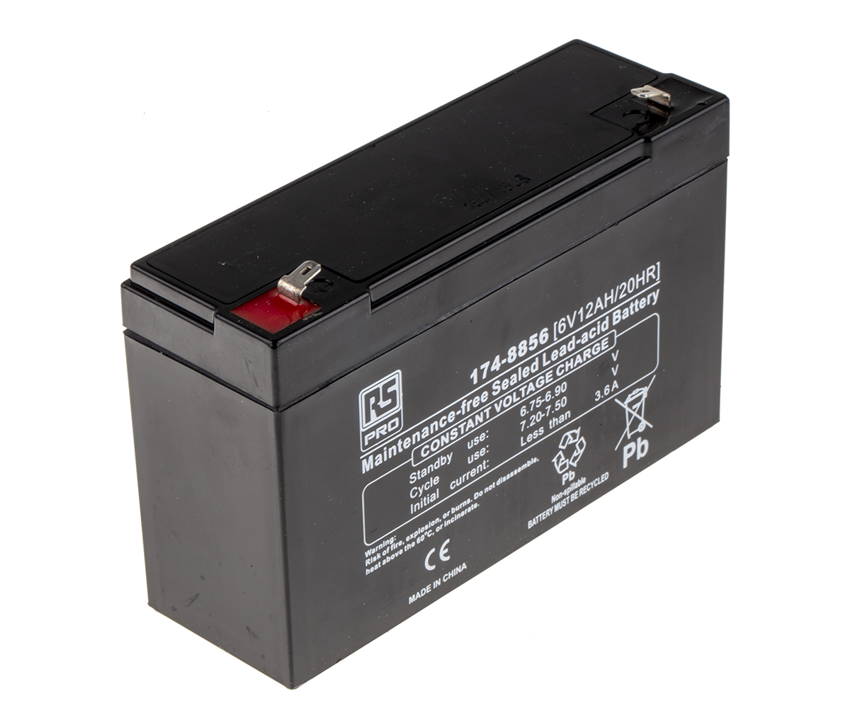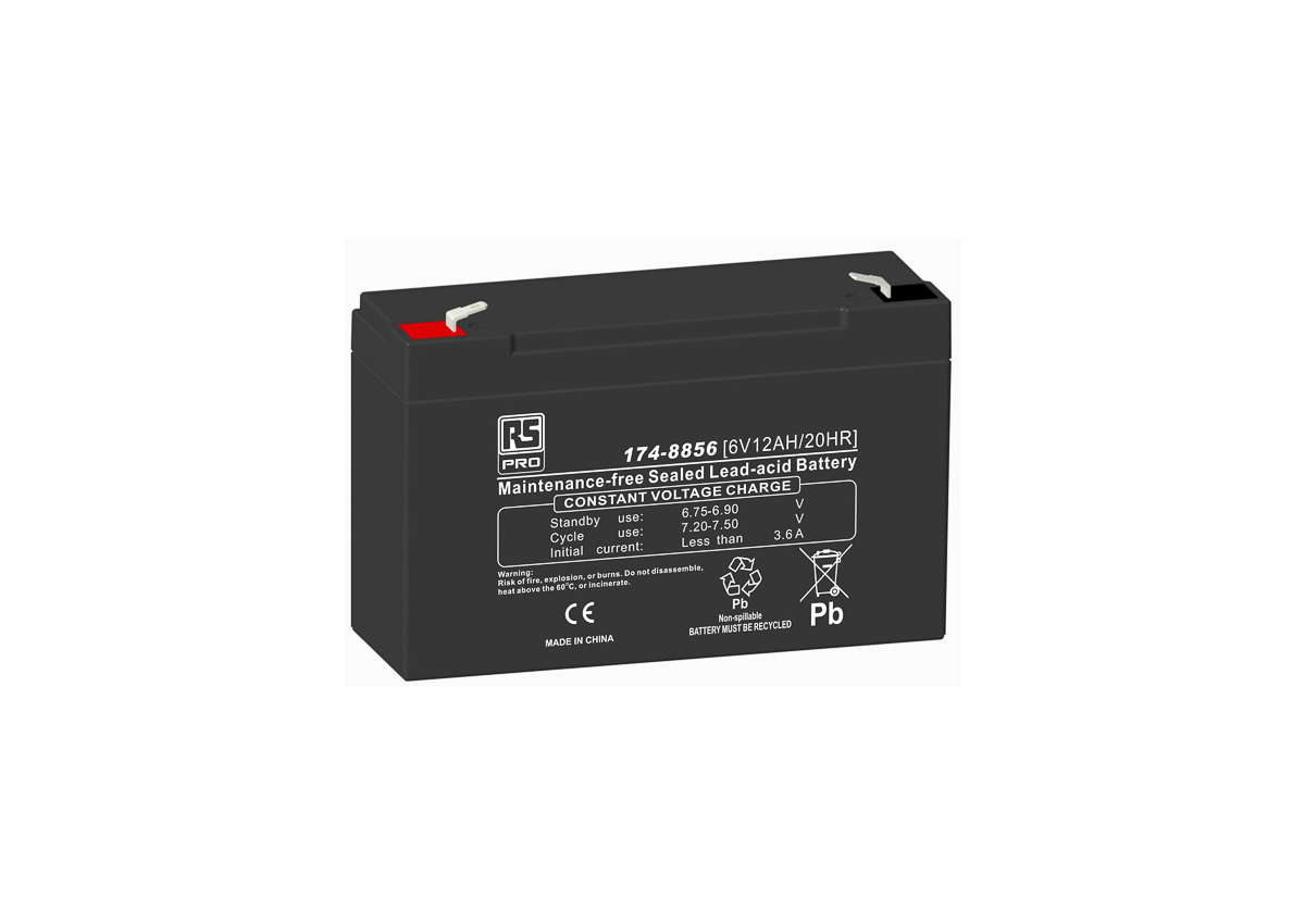 This is Lead Acid Battery - 12Ah manufactured by RS Pro. The manufacturer part number is 174-8856. It has a 3 to 5 years eurobat classification . It is specifically designed for high rate application yes . The module has the capacity of 12ah. The given dimensions of the product include 151 x 51 x 94mm. The typical product's weight is 1.8kg. The product has -20 → +50°c of operating temperature range. Whereas, it has a flame resistant feature no . Applications Information involves stand by use. The product has been well-designed with agm construction. Moreover, it is designed for cyclic application no . Whereas, the minimum operating temperature of the product is - 20°c. The nominal voltage of the product is 6v. It has a/an lead acid chemistry . It has a maximum operating temperature of + 50°c. The terminal is a t1 type. Its brand range is rs pro .