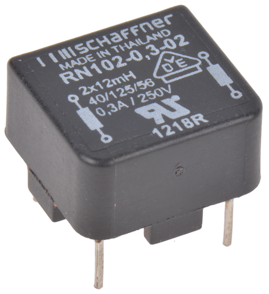 This is 12 mH -30 → +50% Common Mode Choke 300mA Idc 1275mΩ Rdc 300 V ac RN manufactured by Schaffner. The manufacturer part number is RN102-0.3-02-12M. It allows up to 1275mω maximum DC resistance. The given dimensions of the product include 14 x 14 x 9mm. Furthermore, the lead has 0.6mm diameter. The terminal is a pc pin type. While it carries 300ma of maximum DC current. The product rn, is a highly preferred choice for users. Whereas, the minimum operating temperature of the product is -40°c. Its accurate length is 14mm. In addition, the height is 9mm. The product comes in 14mm depth. The product has a 12 mh inductance value. The product is available in through hole configuration. The lead features 10mm pitch. It has a maximum operating temperature of +125°c. It features -30 → +50% of tolerance value.