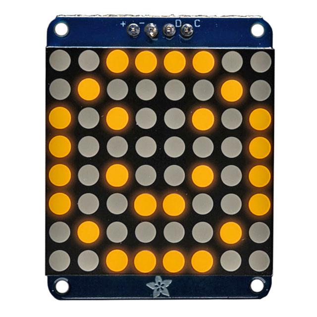 This is manufactured by Adafruit Industries LLC. The manufacturer part number is 871. It is assigned with possible HTSUS value of 8541.41.0000. The product is rohs3 compliant. In addition, it is vendor undefined. A bespoke product is i²c interface. The product is available in matrix configuration. It is shipped in bulk package . The product's diameters include 40.60mm l x 32.00mm w. It consists of 64 (8 x 8) LEDs. It has a long 12 weeks standard lead time. Its typical moisture sensitivity level is 1 (unlimited). The product is available in user defined configuration. It has a classic yellow colour. The product is designated with the ear99 code number.