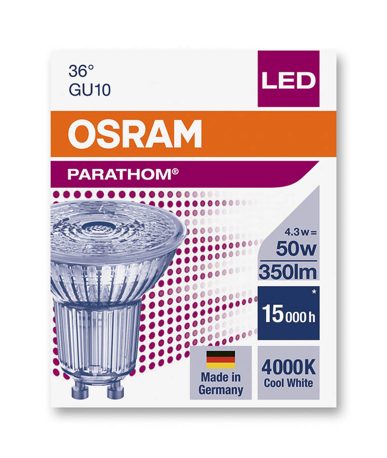 This is LPPAR16 50 36 4.3W/840 230V GU10 manufactured by Osram. The manufacturer part number is 4052899958128. Its diameter is 51mm. It includes a/an reflector shape lamp . This integrates a colour temperature of 4000k. Moreover, the product has a nominal 220 → 240 v voltage rating. The product par16, is a highly preferred choice for users. This product carries 4.3 w. The lamp base is gu10. Its accurate length is 55 mm. It is dimmable no . Features luminosity up to 350 lm. It is a type of led reflector lamp lamp. Adding to this, it has a long life span for about 15000h. The tone of the colour includes cool white.