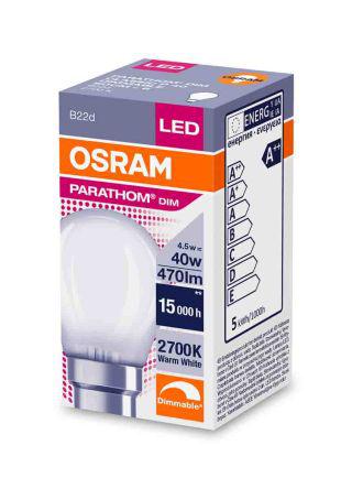 This is P CLAS P B22d GLS LED Bulb 4.5 W(40W) 2700K Warm White manufactured by Osram. The manufacturer part number is 4058075288225. Its diameter is 35mm. This integrates a colour temperature of 2700k. Moreover, the product has a nominal 220 → 240 v voltage rating. The product p clas p, is a highly preferred choice for users. This product carries 4.5 w. In addition, it has about 40w incandescent equivalent wattage . Furthermore, 300° is the viewing angle of the product. It is rated with a++ EU energy efficiency. The lamp base is b22d. Its accurate length is 76 mm. It is dimmable yes . It has about <gteq/>80 colour rendering . Features luminosity up to 470 lm. It is a type of led filament lamp. Adding to this, it has a long life span for about 15000h. The tone of the colour includes warm white.