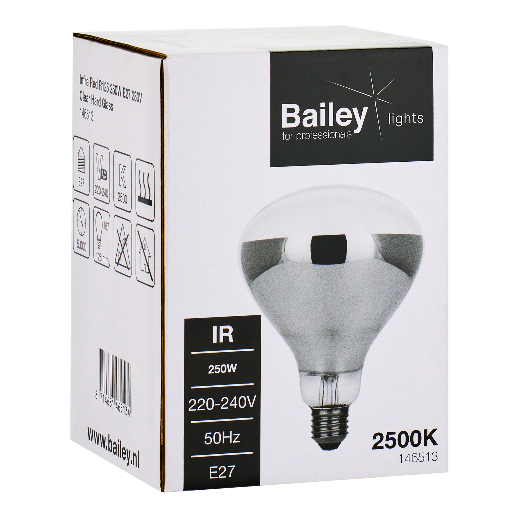 This is Infra Red R125 250W E27 230V CL Hard GL manufactured by Bailey Electric & Electronics bv. The manufacturer part number is 146513.