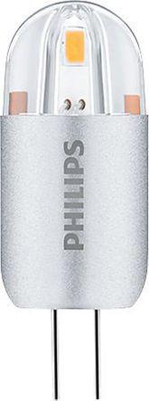 This is LED Capsule Bulb 1.2 W 10W Incandescent Equivalent 120 lm 2700K G4 Clear Warm White manufactured by Philips Lighting. The manufacturer part number is 929001244302. Its diameter is 14.3mm. Moreover, the product has a nominal 12 v voltage rating. Features luminosity up to 120 lm. This product carries 1.2 w. In addition, it has about 10w incandescent equivalent wattage . It exhibits a/an warm white colour light . It has clear lamp finish . It is rated with a++ EU energy efficiency. The lamp base is g4. Its accurate length is 39.2 mm. This integrates a colour temperature of 2700k. It has about 80 colour rendering . Adding to this, it has a long life span for about 15000h.