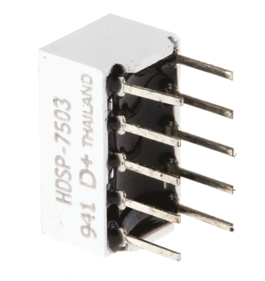 This is 7-Segment LED Display CC Red 5.4 mcd RH DP 7.62mm manufactured by Broadcom. The manufacturer part number is HDSP-7503-CD000. It features a remarkable 7-segment display. It is created with a grey colour face . Whereas, the minimum operating temperature of the product is -40°c. The product is available in through hole configuration. It features 30ma forward current. It has a common cathode connection . It has a dominant wavelength of 626 nm. The product has -40 → +100°c of operating temperature range. The forward voltage is 2 v. It has a standard 7.6mm character in height . It has an external depth of 9.9mm. In addition, it has about 4.2mm character width . It has 5.4 mcd of luminous intensity. It includes 7 segments . Consists of 1 characters. The LED has a classic red colours. Its decimal orientation is to the right side . While its external height is 12.7mm. The product is 7.6mm wide. It has a maximum operating temperature of +100°c. Features 12.7 x 7.6 x 9.91mm external caliber.
