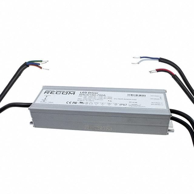This is manufactured by Recom Power. The manufacturer part number is RACD150-700A. It is rated with ip67. It is assigned with possible HTSUS value of 8504.40.9520. The product is rohs3 compliant. Moreover, it has wire leads terminal style. The product features power and watts of 150 w. The maximum product's output current is 700ma. It is approved by ce, ul. The product is available in chassis mount configuration. It offers 90vac of minimum input voltage. It comes in constant current configuration. Dimming Info: analog, pwm. In addition, it is reach unaffected. It is a highly efficient product with an 92% of high efficiency. Its maximum input voltage is 305vac. Topology includes ac dc converter. It is shipped in box package . The product's diameters include 8.00" l x 2.68" w x 1.54" h (203.2mm x 68.0mm x 39.0mm). 3.75 kv of isolation voltage. Its typical moisture sensitivity level is 1 (unlimited). The splendid features of the product include ocp, otp, ovp, scp. The typical product's weight is 2.4 lbs (1.1 kg). The product lightline racd150-a (150w), is a highly preferred choice for users. The product has -40°c ~ 55°c operating temperature range. Furthermore, the output voltage is 60 ~ 210v. Additionally, the product is supplied with 1 outputs. The product is designated with the ear99 code number.