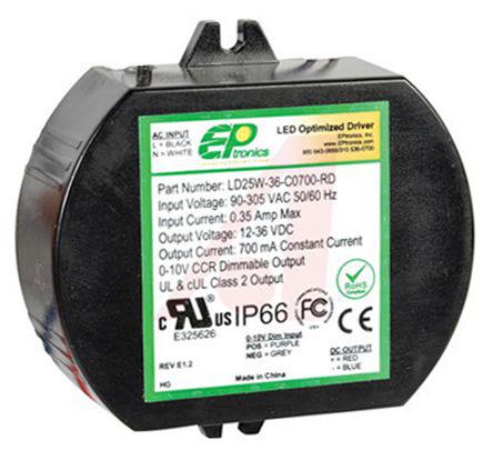 This is Constant Current ELV LED Driver 25W 72V 350mA LD25W Series manufactured by EPtronics INC.. The manufacturer part number is LD25W-72-C0350-TE. Additionally, the product is supplied with 1 outputs. Additionally, its diming operation is elv . The product has a current rating of 250ma. The product complies with all safety standards, such as ce, csa 22.2, culus, e325626, en61000-3-2, en61000-3-3, en61347, fcc, ul8750. It carries 350ma output current. It is IP rated with ip66. The product ld25w, is a highly preferred choice for users. Moreover, the product has a nominal 230v ac voltage rating. The product offers a maximum 25w output power . It has ac input voltage. Its primary type is ac-dc . Its input voltage is 230 v ac. Features a 72v output voltage. Moreover, the product allow the output of 72 v dc @ 350 ma. It allows to operate using constant current. The product is available in encapsulated configuration.