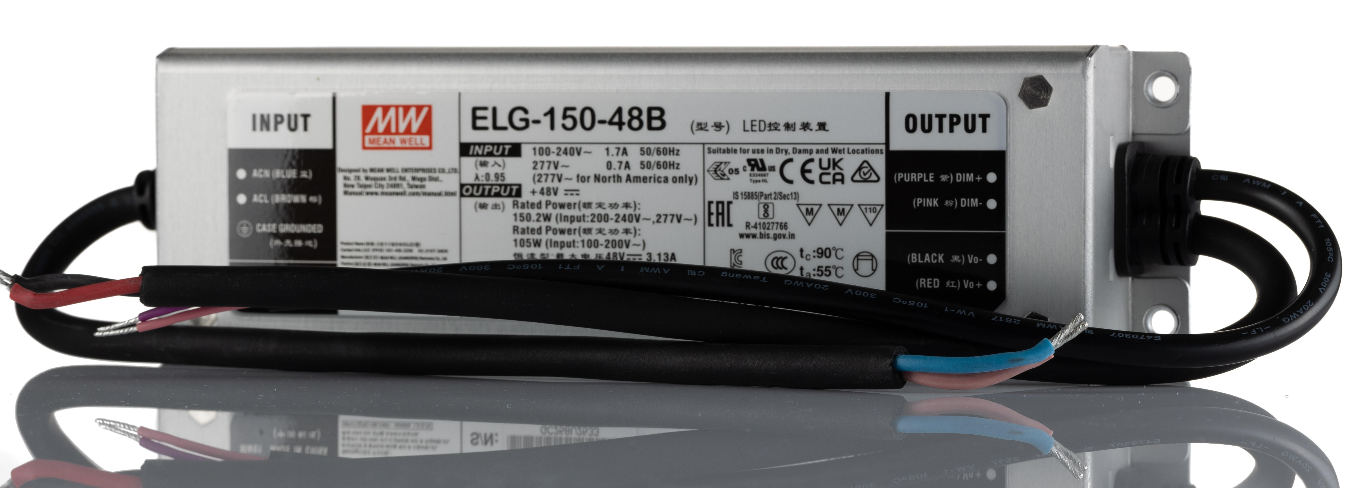 This is Constant Current / Constant Voltage LED Driver 150W 48V 3A ELG-150 Series manufactured by Mean Well. The manufacturer part number is ELG-150-48B. Additionally, the product is supplied with 1 outputs. Additionally, it has a/an led driver type LED driver . The product has a current rating of 900ma. The product complies with all safety standards, such as cb, ce:ccc, culus recognized, en61347-1, en61347-2-13, en62384, enec, pfc, ul8750. It carries 3a output current. It is IP rated with ip67. The product elg-150, is a highly preferred choice for users. Moreover, the product has a nominal 180 → 305 v ac, 254 → 431 v dc voltage rating. The product offers a maximum 150w output power . It has ac, dc input voltage. Its primary type is ac-dc, dc-dc . It is dimmable yes . Features a 48v output voltage. Moreover, the product allow the output of 48 v dc @ 3.13 a. It allows to operate using constant current / constant voltage. The product is available in encapsulated configuration. Its input voltage is 180 → 305 v ac, 254 → 431 v dc.