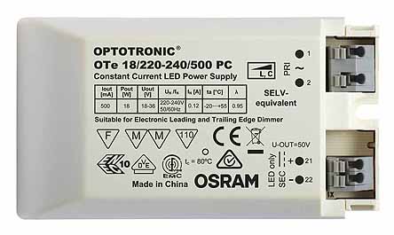 This is Constant Current Leading Edge LED Driver Module 18W 18 → 36V 500mA manufactured by Osram. The manufacturer part number is OTE 18/220-240/500 PC. Additionally, the product is supplied with 1 outputs. Additionally, it has a/an led driver type LED driver . Additionally, its diming operation is leading edge . The product complies with all safety standards, such as cb, ce, cispr 15, enec 10, iec 61000-3-2, iec 61000-3-3, iec 61347-1, iec 61347-2-13, iec 61547, iec 62384, vde. It carries 500ma output current. It is IP rated with ip20. Moreover, the product has a nominal 198 → 264v ac voltage rating. The product offers a maximum 18w output power . It has ac input voltage. It has about 3.5w power dissipation . Its primary type is ac-dc . It is dimmable yes . Features a 18 → 36v output voltage. Moreover, the product allow the output of 18 → 36 v @ 500 ma. It allows to operate using constant current. The product is available in sealed configuration. Its input voltage is 198 → 264 v ac.