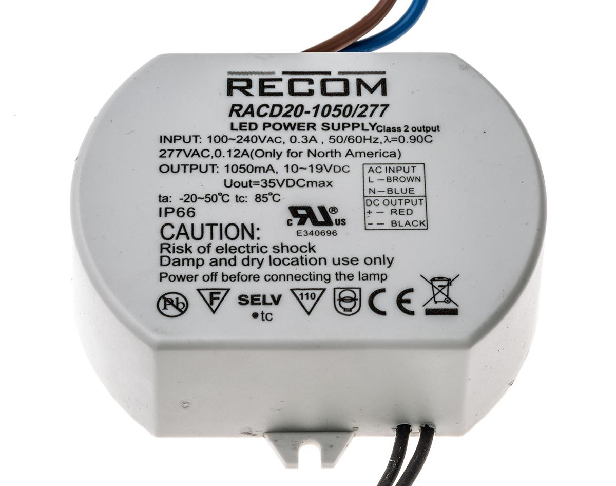 This is Constant Current LED Driver 20W 18.8 → 19V 1.05A manufactured by Recom. The manufacturer part number is RACD20-1050/277. Additionally, the product is supplied with 1 outputs. It carries 1.05a output current. It is IP rated with ip20. The product racd20/277, is a highly preferred choice for users. The product offers a maximum 20w output power . It has ac input voltage. Its primary type is ac-dc . Its input voltage is 130 → 430 v dc, 90 → 305 v ac. Features a 10.8 → 19v dc output voltage. It allows to operate using constant current. The product is available in enclosed configuration.