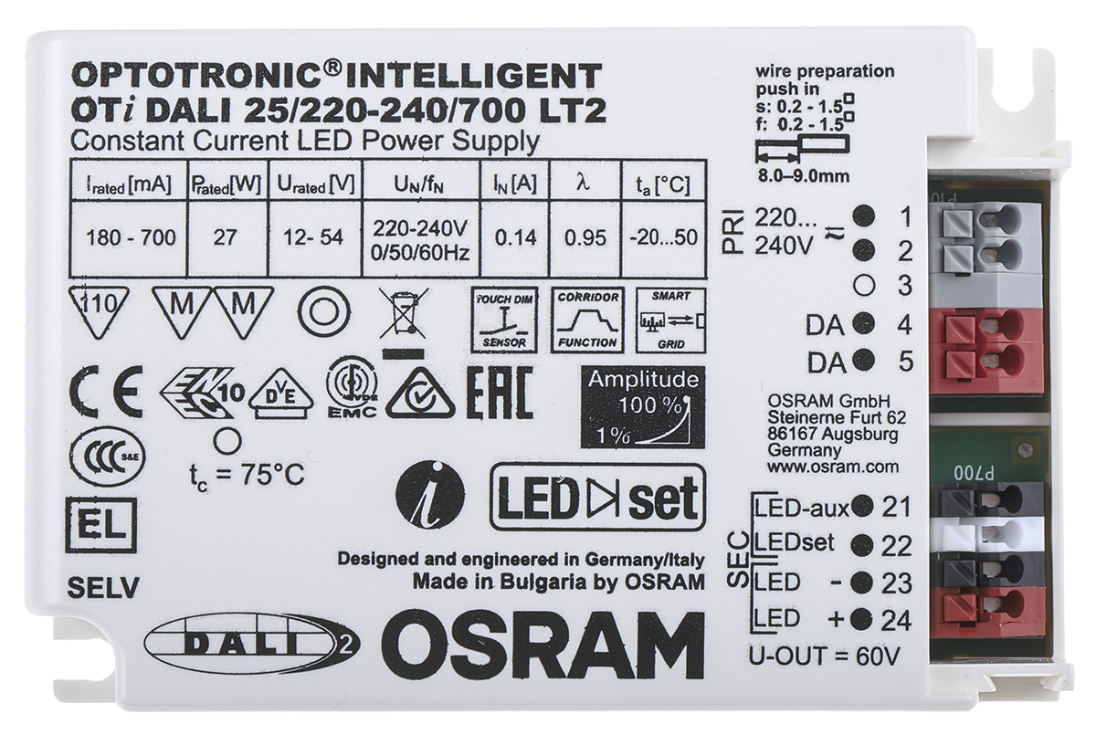 This is Constant Current Dimmable LED Driver Module 27W 12 → 54V 700mA manufactured by Osram. The manufacturer part number is OTi DALI 25/220-240/700 LT2. Additionally, the product is supplied with 1 outputs. Additionally, it has a/an led driver type LED driver . Additionally, its diming operation is dali . The product complies with all safety standards, such as ce, el, emc, en55015, en61000-3-2, en61347-1, en61347-2-13, en61547, en-62384, enec 10, vde. It carries 700ma output current. It is IP rated with ip20. The product optotronic intelligent, is a highly preferred choice for users. Moreover, the product has a nominal 176 → 276 v dc, 198 → 264 v ac voltage rating. The product offers a maximum 27w output power . It has ac, dc input voltage. Its primary type is ac-dc, dc-dc . It is dimmable yes . Features a 12 → 54v output voltage. Moreover, the product allow the output of 12 → 54 v @ 700 ma. It allows to operate using constant current. The product is available in sealed configuration. Its input voltage is 176 → 276 v dc, 198 → 264 v ac.