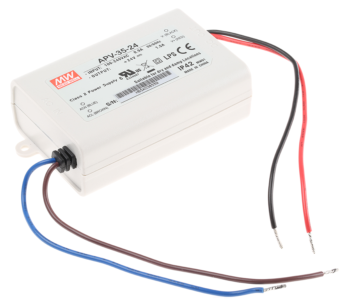 This is Constant Voltage LED Driver 36W 24V 1.5A manufactured by Mean Well. The manufacturer part number is APV-35-24. Additionally, the product is supplied with 1 outputs. The product is available in enclosed configuration. It is IP rated with ip30. The product apv-35, is a highly preferred choice for users. Its sub type is led driver . The product offers a maximum 36w output power . It has about 36w power dissipation . Its primary type is ac-dc . Its input voltage is 127 → 370 v dc, 90 → 264 v ac. Features a 24 v output voltage. led driver is a versatile product designed to provide user-defined applications. The terminal is a wire type. It has a screw type mount .