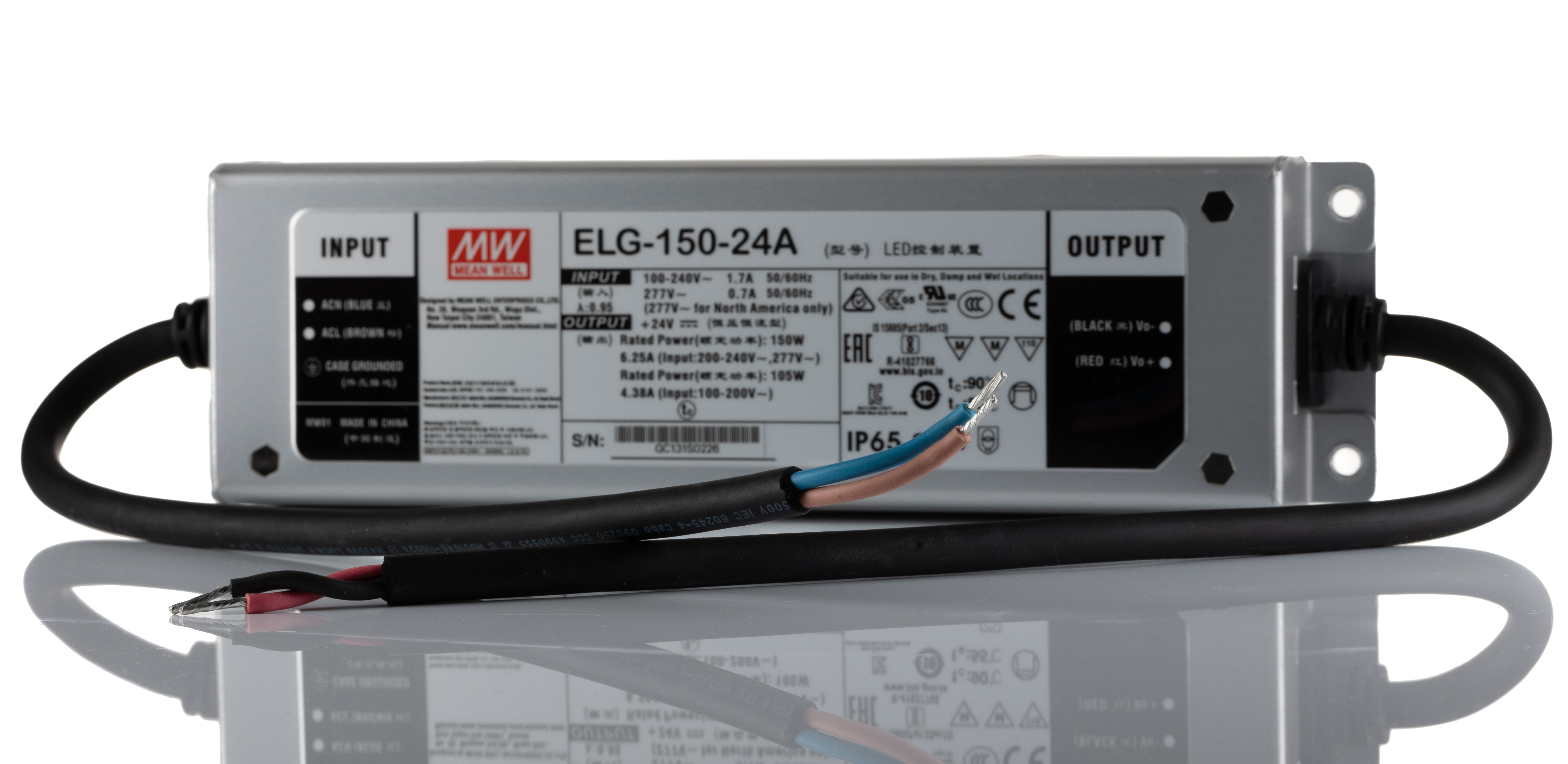 This is Constant Current / Constant Voltage Potentiometer LED Driver 150W 24V 6A ELG-150 Series manufactured by Mean Well. The manufacturer part number is ELG-150-24A. Additionally, the product is supplied with 1 outputs. Additionally, it has a/an led driver type LED driver . Additionally, its diming operation is potentiometer . The product has a current rating of 900ma. The product complies with all safety standards, such as cb, ce:ccc, culus recognized, en61347-1, en61347-2-13, en62384, enec, pfc, ul8750. It carries 6a output current. It is IP rated with ip65. The product elg-150, is a highly preferred choice for users. Moreover, the product has a nominal 180 → 305 v ac, 254 → 431 v dc voltage rating. The product offers a maximum 150w output power . It has ac, dc input voltage. Its primary type is ac-dc, dc-dc . It is dimmable yes . Features a 24v output voltage. Moreover, the product allow the output of 24 v dc @ 6.25 a. It allows to operate using constant current / constant voltage. The product is available in encapsulated configuration. Its input voltage is 180 → 305 v ac, 254 → 431 v dc.