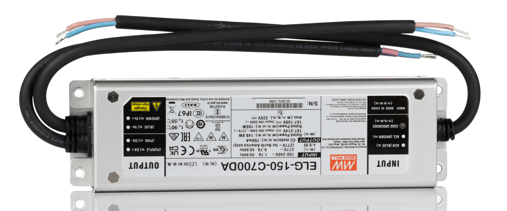 This is Constant Current DALI LED Driver 150W 225V 700mA ELG-150-C Series manufactured by Mean Well. The manufacturer part number is ELG-150-C700DA. Additionally, the product is supplied with 1 outputs. Additionally, it has a/an led driver type LED driver . Additionally, its diming operation is dali . The product has a current rating of 900ma. The product complies with all safety standards, such as cb, ce:ccc, culus recognized, en61347-1, en61347-2-13, enec, pfc, ul8750. It carries 700ma output current. It is IP rated with ip67. The product elg-150-c, is a highly preferred choice for users. Moreover, the product has a nominal 180 → 295 v ac, 255 → 417 v dc voltage rating. The product offers a maximum 150w output power . It has ac, dc input voltage. Its primary type is ac-dc, dc-dc . It is dimmable yes . Features a 225v output voltage. Moreover, the product allow the output of 225 v dc @ 700 ma. It allows to operate using constant current. The product is available in encapsulated configuration. Its input voltage is 180 → 295 v ac, 255 → 417 v dc.