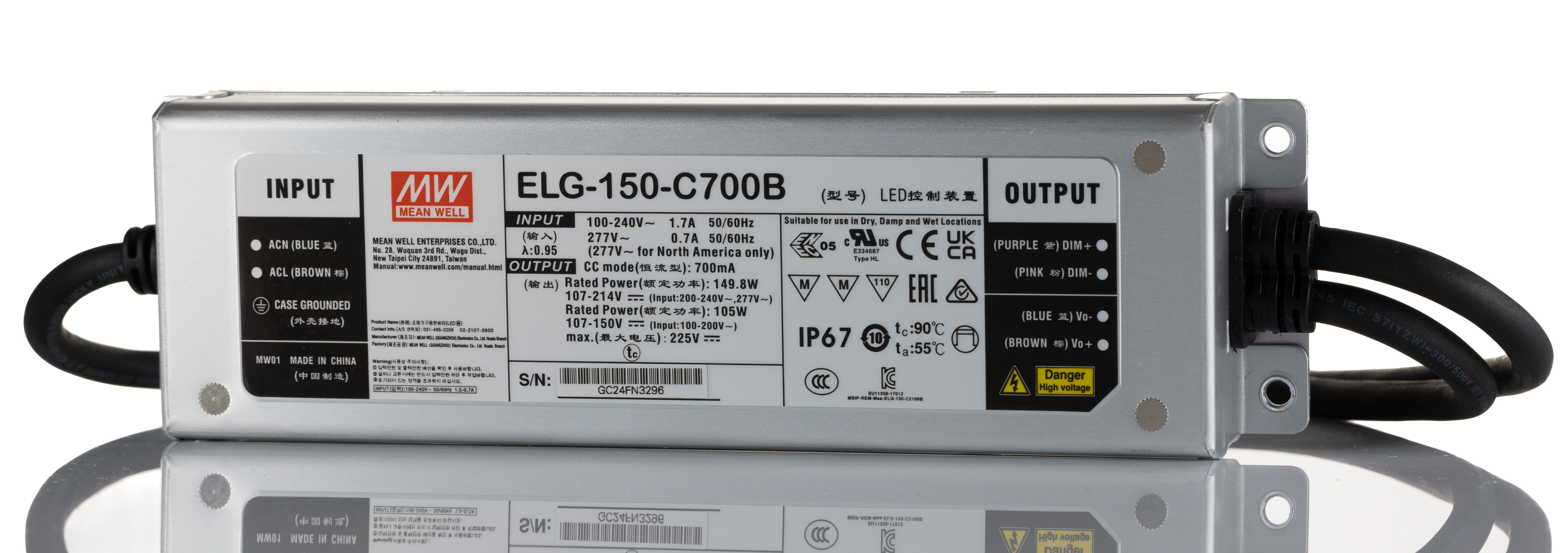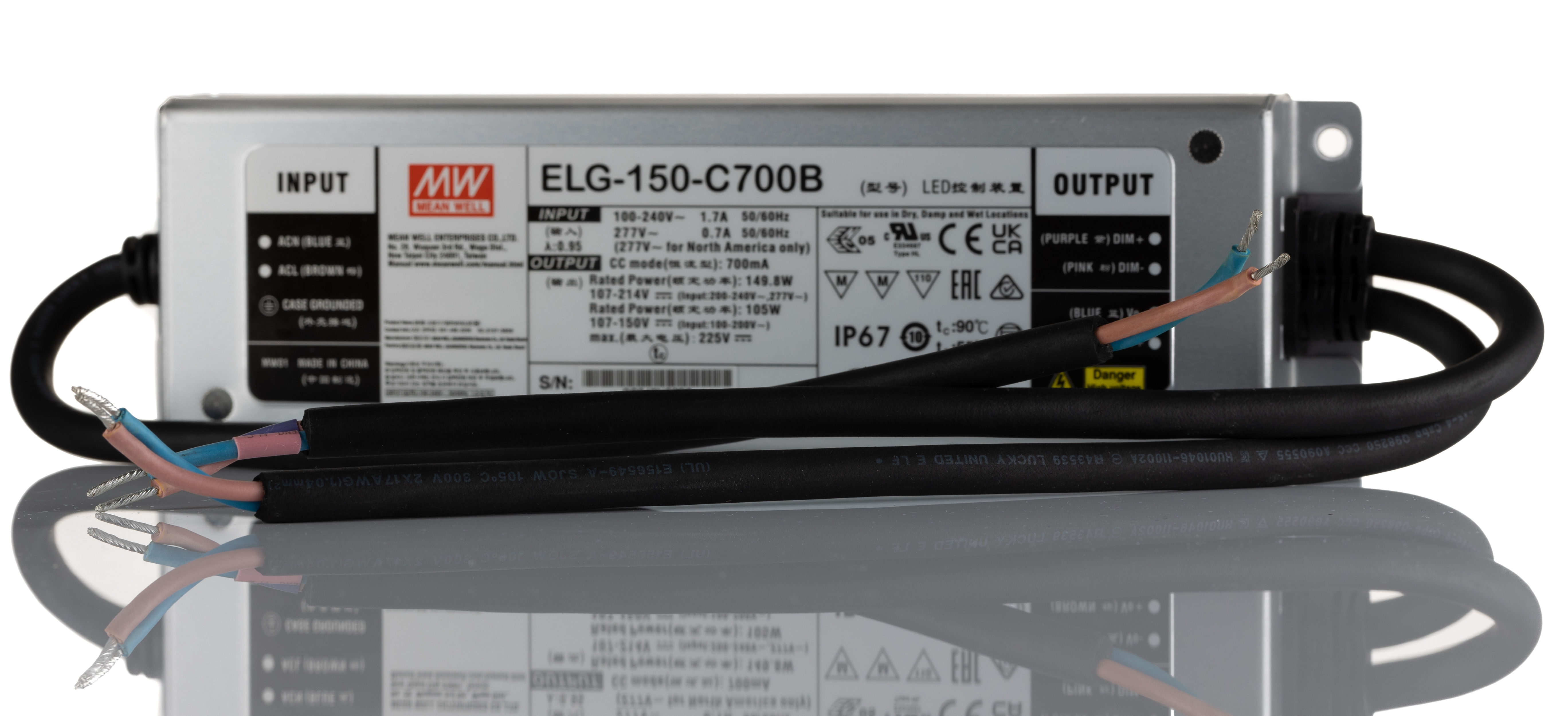 This is Constant Current LED Driver 150W 225V 700mA ELG-150-C Series manufactured by Mean Well. The manufacturer part number is ELG-150-C700B. Additionally, the product is supplied with 1 outputs. Additionally, it has a/an led driver type LED driver . The product has a current rating of 900ma. The product complies with all safety standards, such as cb, ce:ccc, culus recognized, en61347-1, en61347-2-13, enec, pfc, ul8750. It carries 700ma output current. It is IP rated with ip67. The product elg-150-c, is a highly preferred choice for users. Moreover, the product has a nominal 180 → 295 v ac, 255 → 417 v dc voltage rating. The product offers a maximum 150w output power . It has ac, dc input voltage. Its primary type is ac-dc, dc-dc . It is dimmable yes . Features a 225v output voltage. Moreover, the product allow the output of 225 v dc @ 700 ma. It allows to operate using constant current. The product is available in encapsulated configuration. Its input voltage is 180 → 295 v ac, 255 → 417 v dc.