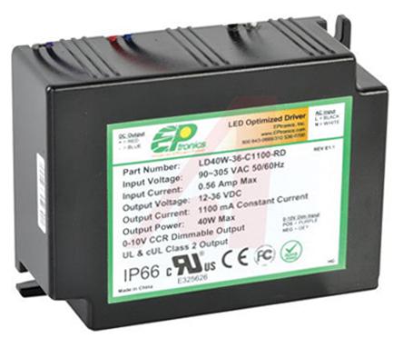 This is Constant Current 1-10 V LED Driver 40W 12V 3.33A LD40W Series manufactured by EPtronics INC.. The manufacturer part number is LD40W-12-C3330-RD. Additionally, the product is supplied with 1 outputs. Additionally, its diming operation is 1-10 v . The product has a current rating of 400ma. The product complies with all safety standards, such as ce, csa 22.2, culus, e325626, en61000-3-2, en61000-3-3, en61347, fcc, ul8750. It carries 3.33a output current. It is IP rated with ip66. The product ld40w, is a highly preferred choice for users. Moreover, the product has a nominal 90 → 305v ac voltage rating. The product offers a maximum 40w output power . It has ac input voltage. Its primary type is ac-dc . Its input voltage is 90 → 305 v ac. Features a 12v output voltage. Moreover, the product allow the output of 12 v dc @ 3330 ma. It allows to operate using constant current. The product is available in encapsulated configuration.