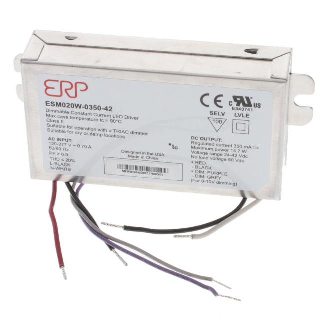 This is manufactured by ERP Power, LLC. The manufacturer part number is ESM020W-0350-42. It is rated with ip20, nema 410. It is assigned with possible HTSUS value of 8504.40.9510. The product is rohs3 compliant. Moreover, it has wire leads terminal style. The product features power and watts of 15 w. The maximum product's output current is 350ma. It is approved by cul, ul, crucs, fc, ce, cb. It offers 120vac of minimum input voltage. It comes in constant current configuration. Dimming Info: elv, triac. In addition, it is reach unaffected. It is a highly efficient product with an 87% of high efficiency. Its maximum input voltage is 277vac. The erp power, llc's product offers user-desired applications. The product's diameters include 4.20" l x 2.37" w x 0.99" h (106.7mm x 60.3mm x 25.2mm). It has a long 8 weeks standard lead time. The splendid features of the product include ocp, otp, scp. Its typical moisture sensitivity level is not applicable. The product is available in chassis mount configuration. The typical product's weight is 0.556 lb (252 g). The product esm (20w), is a highly preferred choice for users. The product has -30°c ~ 90°c operating temperature range. Furthermore, the output voltage is 28 ~ 42v. In addition, box is the available packaging type of the product. Moreover, it corresponds to esm020w, a base product number of the product. Topology includes ac dc converter. Additionally, the product is supplied with 1 outputs. The product is designated with the ear99 code number.