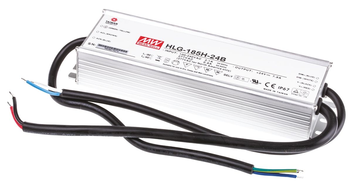 This is Constant Current 1-10 V PWM Resistance LED Driver 187.2W 24V 7.8A manufactured by Mean Well. The manufacturer part number is HLG-185H-24B. Additionally, the product is supplied with 1 outputs. Additionally, it has a/an led driver type LED driver . Additionally, its diming operation is 1-10 v pwm resistance . It carries 7.8a output current. It is IP rated with ip67. Moreover, the product has a nominal 127 → 370 v dc, 90 → 264 v ac voltage rating. It has ac, dc input voltage. The product offers a maximum 187.2w output power . It is dimmable yes . Features a 24v output voltage. It allows to operate using constant current. Its input voltage is 127 → 370 v dc, 90 → 264 v ac.
