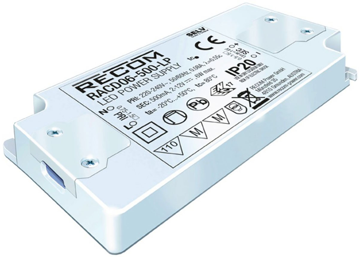 This is                Constant Current LED Driver Module 6W 9V manufactured by Recom. The manufacturer part number is RACD06-700-LP. Additionally, the product is supplied with 1 outputs. Additionally, it has a/an led driver type LED driver . The product has a current rating of 0 → 700ma. The product complies with all safety standards, such as cb, ce, en 55015, en 61000-3-2 class c, en 61000-3-3, en 61000-4-11 criteria b, en 61000-4-11 criteria c, en 61000-4-2 criteria b, en 61000-4-3 criteria a, en 61000-4-4 criteria b, en 61000-4-5 criteria c, en 61000-4-6 criteria a, en 61347-1, en 61347-2-13, en 61493, en 61547, enec, erp compliant, iec 61347-1, iec 61347-2-13, iec/en 62384. It carries 700ma output current. It is IP rated with ip20. The product racd06-lp, is a highly preferred choice for users. Moreover, the product has a nominal 264v ac voltage rating. The product offers a maximum 6w output power . It has ac input voltage. Its primary type is ac-dc . It is dimmable no . Features a 2 → 9v dc output voltage. It allows to operate using constant current. The product is available in enclosed configuration. Its input voltage is 198 → 264 v ac.