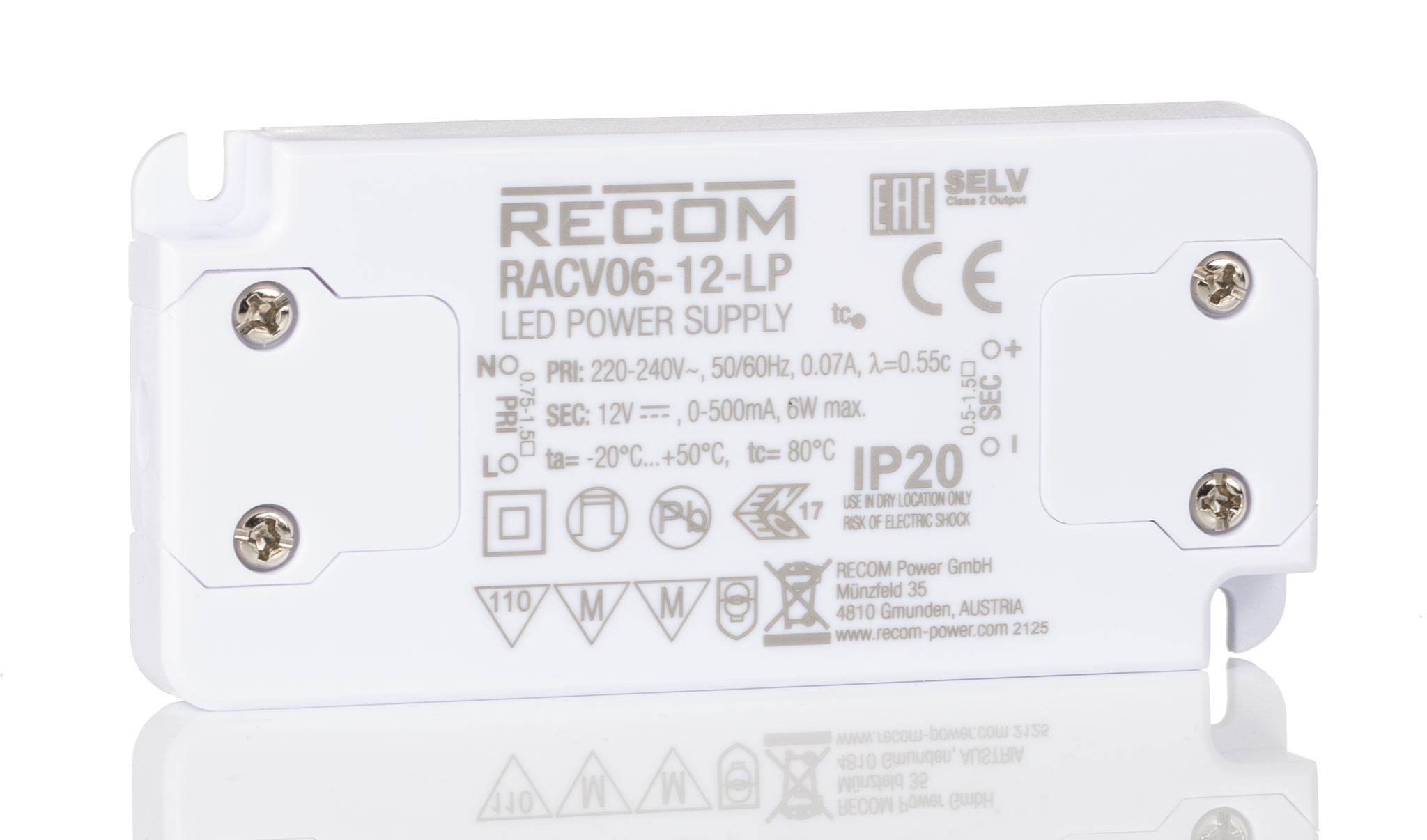 This is Constant Voltage LED Driver Module 6W 12V 500mA RACV06-LP Series manufactured by Recom. The manufacturer part number is RACV06-12-LP. Additionally, the product is supplied with 1 outputs. Additionally, it has a/an led driver type LED driver . The product has a current rating of 0 → 500ma. The product complies with all safety standards, such as cb, ce, en 55015, en 61000-3-2 class c, en 61000-3-3, en 61000-4-11 criteria b, en 61000-4-11 criteria c, en 61000-4-2 criteria b, en 61000-4-3 criteria a, en 61000-4-4 criteria b, en 61000-4-5 criteria c, en 61000-4-6 criteria a, en 61347-1, en 61347-2-13, en 61493, en 61547, enec, erp compliant, iec 61347-1, iec 61347-2-13, iec/en 62384. It carries 500ma output current. It is IP rated with ip20. The product racv06-lp, is a highly preferred choice for users. Moreover, the product has a nominal 264v ac voltage rating. The product offers a maximum 6w output power . It has ac input voltage. Its primary type is ac-dc . It is dimmable no . Features a 12v dc output voltage. It allows to operate using constant voltage. The product is available in enclosed configuration. Its input voltage is 198 → 264 v ac.