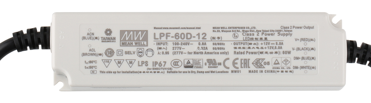 This is Constant Voltage 1-10 V PWM Resistance LED Driver 60W 12V 5A manufactured by Mean Well. The manufacturer part number is LPF-60D-12. Additionally, it has a/an led driver type LED driver . Additionally, its diming operation is 1-10 v pwm resistance . It carries 5a output current. It is IP rated with ip67. Moreover, the product has a nominal 127 → 431 v dc, 90 → 305 v ac voltage rating. It has ac, dc input voltage. The product offers a maximum 60w output power . It is dimmable yes . Features a 12v output voltage. It allows to operate using constant voltage. Its input voltage is 127 → 431 v dc, 90 → 305 v ac.