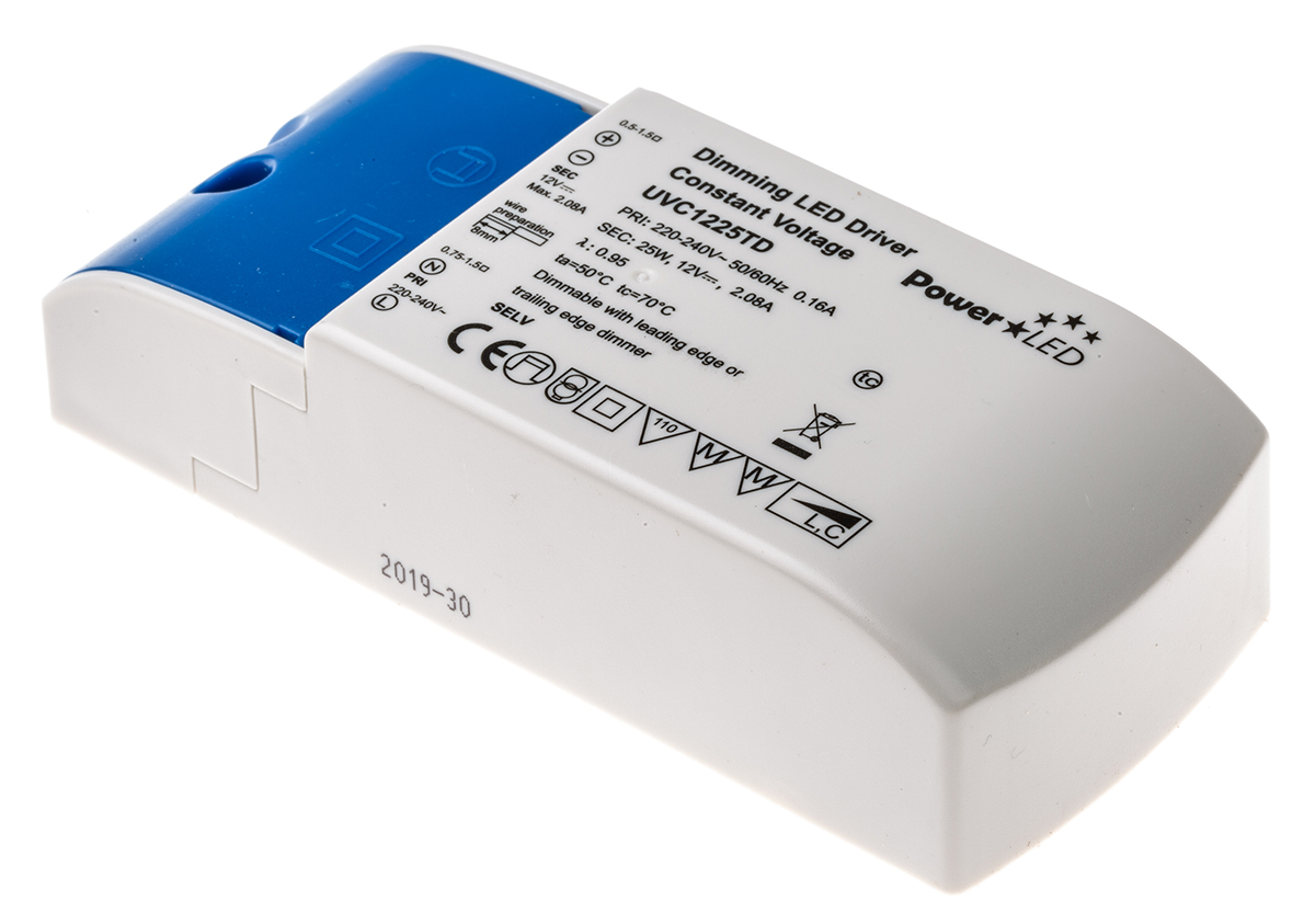 This is Constant Voltage Triac LED Driver 25W 12V 2.08A UVC25TD Series manufactured by PowerLED. The manufacturer part number is UVC1225TD. Additionally, it has a/an led driver type LED driver . Additionally, its diming operation is triac . The product has a current rating of 200ma. It carries 2.08a output current. It is IP rated with ip20. The product uvc25td, is a highly preferred choice for users. Moreover, the product has a nominal 240v ac voltage rating. It has ac input voltage. The product offers a maximum 25w output power . It is dimmable yes . Features a 12v output voltage. It allows to operate using constant voltage. The product is available in enclosed configuration. Its input voltage is 180 → 240 v ac.