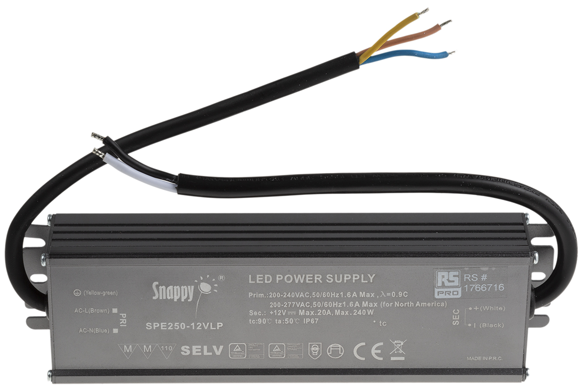 This is AC200-277V 12VDC 20A 240W IP67 manufactured by RS Pro. The manufacturer part number is 176-6716. Additionally, the product is supplied with 1 outputs. Additionally, it has a/an led driver type LED driver . The product has a current rating of <75 (inrush)a. It carries 20a output current. It is IP rated with ip20. Moreover, the product has a nominal 200 → 277v ac voltage rating. The product offers a maximum 250w output power . It has ac input voltage. Its primary type is ac-dc . Its input voltage is 200 → 277 v ac. Features a 12v output voltage. Moreover, the product allow the output of 12 v dc @ 20 a. It allows to operate using constant voltage. The product is available in enclosed configuration.