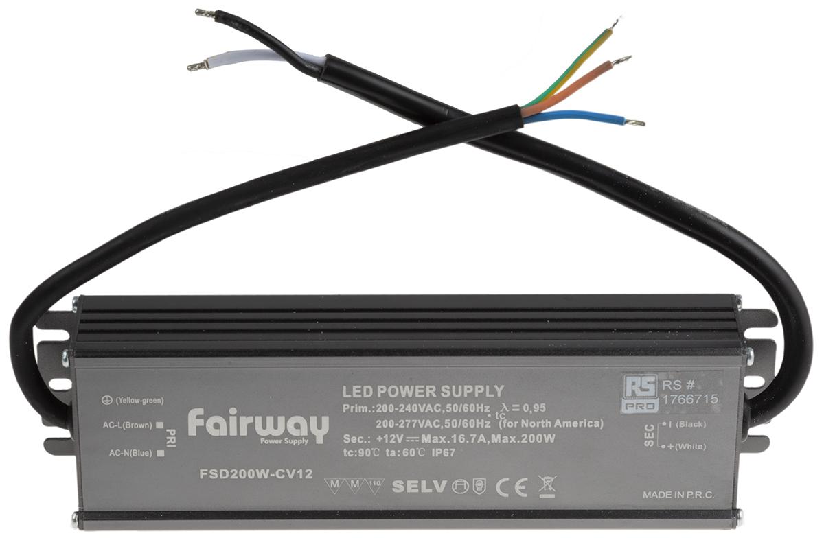 This is AC200-277V 12VDC 16.7A 200W IP67 manufactured by RS Pro. The manufacturer part number is 176-6715. Additionally, the product is supplied with 1 outputs. It carries 16.7a output current. It is IP rated with ip20. Moreover, the product has a nominal 200 → 277v ac voltage rating. The product offers a maximum 200w output power . It has ac input voltage. Its primary type is ac-dc . Its input voltage is 200 → 277 v ac. Features a 12v output voltage. Moreover, the product allow the output of 12 v dc @ 16.7 a. It allows to operate using constant voltage. The product is available in enclosed configuration.