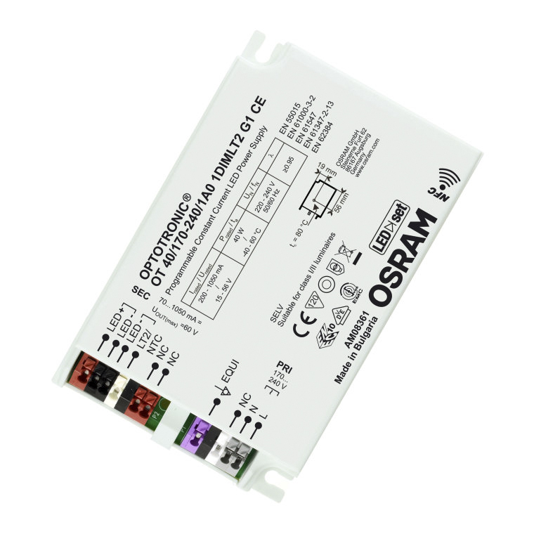 This is OT 40/170-240/1A0 1DIM LT2 G1 CE manufactured by Osram. The manufacturer part number is 4052899517424. Additionally, the product is supplied with 1 outputs. Additionally, it has a/an led driver type LED driver . The product has a current rating of 200ma. It carries 70 → 1050ma output current. It is IP rated with ip20. The product optotronic nfc, is a highly preferred choice for users. Moreover, the product has a nominal 220 → 240v voltage rating. The product offers a maximum 40w output power . It has ac input voltage. Its primary type is ac-dc . It is dimmable yes . Features a 15 → 56v output voltage. Moreover, the product allow the output of 15 → 56 v dc @ 1050 ma. It allows to operate using constant current. Its input voltage is 170 → 264 v ac.