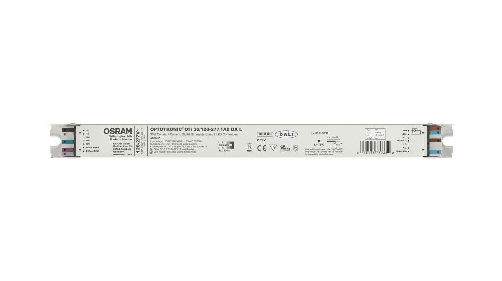 This is Constant Current DALI LED Driver 18W 7.5 → 54V 350mA Oti-DALI Series manufactured by Osram. The manufacturer part number is OTi-30/120-277/1A0-DX-L. Additionally, it has a/an led driver type LED driver . It carries 350ma output current. The product oti-dali, is a highly preferred choice for users. Additionally, its diming operation is dali . The product offers a maximum 18w output power . It is dimmable yes . Features a 7.5 → 54v output voltage. It allows to operate using constant current. Its input voltage is 220 → 240 v.