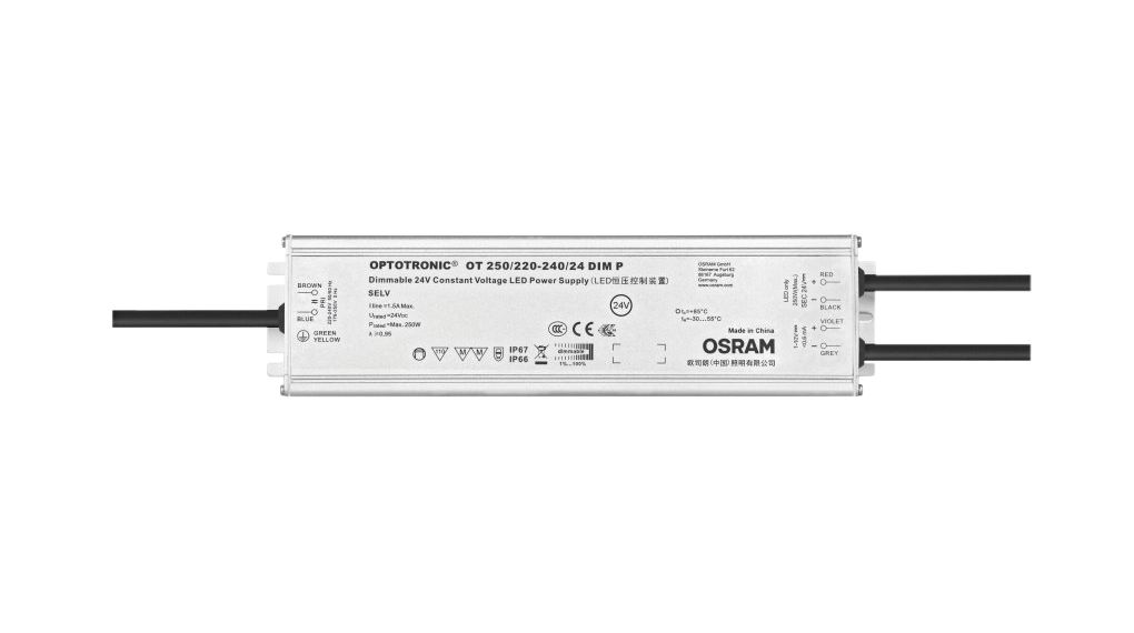This is 24V Output 250W Output Constant Voltage Dimmable manufactured by Osram. The manufacturer part number is OT-250/220-240/24-DIM-P. The product offers a maximum 250w output power . It is dimmable yes . Features a 24v output voltage. It allows to operate using constant voltage. Its input voltage is 264 v ac.