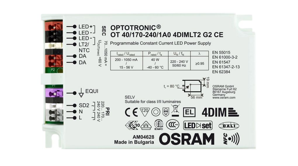 This is 56V Output 40W Output 700mA Output Constant Current Dimmable manufactured by Osram. The manufacturer part number is OT40/170-240/1A0-4DIMLT2-G2-CE. It carries 700ma output current. The product offers a maximum 40w output power . It is dimmable yes . Features a 56v output voltage. It allows to operate using constant current. Its input voltage is 264 v ac.
