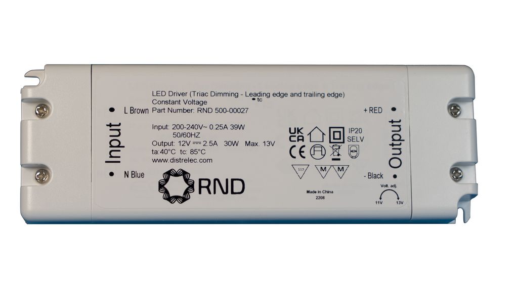 This is LED Driver 12V Output 30W Output 2.5A Output Constant Voltage Dimmable manufactured by RND. The manufacturer part number is RND 500-00027. Additionally, it has a/an led driver type LED driver . It carries 2.5a output current. The product offers a maximum 30w output power . It is dimmable yes . Features a 12v output voltage. It allows to operate using constant voltage. Its input voltage is 200 → 240 v.