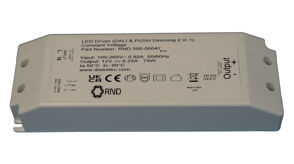 This is LED Driver 12V Output 75W Output 6.25A Output Constant Voltage Dimmable manufactured by RND. The manufacturer part number is RND 500-00047. Additionally, it has a/an led driver type LED driver . It carries 6.25a output current. The product offers a maximum 75w output power . It is dimmable yes . Features a 12v output voltage. It allows to operate using constant voltage. Its input voltage is 200 → 240 v.