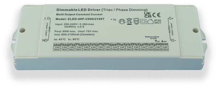 This is Dimmable LED Driver 3 → 65V Output 60W Output 2100mA Output Constant Current Dimmable manufactured by RS PRO. The manufacturer part number is 360-653. Additionally, the product is supplied with 8 outputs. Additionally, it has a/an dimmable led driver type LED driver . Additionally, its diming operation is triac . The product has a current rating of 2100ma. The product complies with all safety standards, such as en55015, en61000-3-2, en61000-4-2,3,4,5,6,11, en61347-1, en61347-2-13, en61547, fcc part 15b, ul8750. It carries 2100ma output current. It is IP rated with ip20. Moreover, the product has a nominal 200 → 240v ac voltage rating. The product offers a maximum 60w output power . It has ac input voltage. Its primary type is ac . It is dimmable yes . Features a 3 → 65v output voltage. It allows to operate using constant current. Its input voltage is 200 → 240v ac.