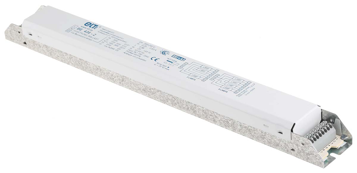 This is 18 W 24 W 30 W 36 W 39 W Electronic Compact Fluorescent Lighting Ballast 220 → 240 V manufactured by ELT. The manufacturer part number is BE 436-2. Moreover, the product has a nominal 220 → 240 v voltage rating. This product carries 18 w, 24 w, 30 w, 36 w, 39 w. Additionally, it has a t5, t8, tc-l lamp supported shape . It contains a/an electronic type ballast . Its accurate length is 360 mm. It is dimmable no . Whereas, the minimum operating temperature of the product is -20°c. It has a/an compact fluorescent, fluorescent type supported lamp . It has a high frequency feature yes . In addition, the height is 28mm. It has a maximum operating temperature of +50°c.
