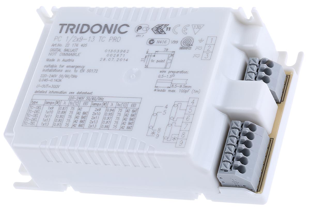 This is 10 W Electronic Fluorescent Lighting Ballast 220 → 240 V manufactured by Tridonic. The manufacturer part number is 22176405. It is rated with a2 EU energy efficiency. Moreover, the product has a nominal 220 → 240 v voltage rating. This product carries 10 w. Additionally, it has a t4 lamp supported shape . In addition, the height is 31mm. Furthermore, the product is 67 mm wide. Its accurate length is 103 mm. It is dimmable no . Whereas, the minimum operating temperature of the product is -25°c. It has a/an fluorescent type supported lamp . It has a high frequency feature yes . It contains a/an electronic type ballast . It has a maximum operating temperature of +70°c.
