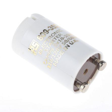 This is Electronic Fluorescent Light Starter 18 → 20 W 110 V ac 35 mm length 21.5mm diameter manufactured by RS Pro. The manufacturer part number is 809-352. Its diameter is 21.5mm. Moreover, the product has a nominal 110 v ac voltage rating. This product carries 18 → 20 w. It has a Failed Lamp Shutdown Time of about 5s It includes 2 lamp(s) . Its accurate length is 35 mm. It is comprised of 2 pins. It comes in electronic configuration.