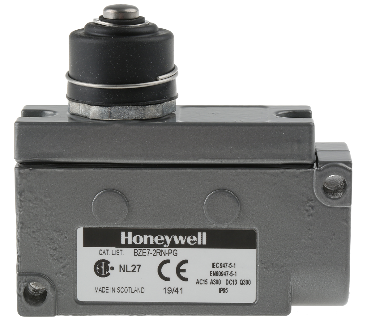 This is IP65 Snap Action Limit Switch Plunger Die Cast Aluminium NO/NC 480V manufactured by Honeywell. The manufacturer part number is BZE7-2RN-PG. It has 250v maximum DC voltage. A bespoke product carries 480v of maximum AC voltage. It has a 255 → 680 g of operating force. The product complies with all safety standards, such as csa, en/iec 60947-5-1. It also carries 15a maximum current. It is IP rated with ip65. The product bze7, is a highly preferred choice for users. Its accurate length is 76.4mm. It has spdt pole and throw configuration. The product also features robust die cast aluminium housing material. Additionally, it performs a snap action type action . The product comes in 39.37mm depth. Whereas, its mounting orientation is side . The product carries plunger actuator. The normal state configuration includes no/nc. It has a maximum operating temperature of +71°c. Whereas, the minimum operating temperature of the product is -30°c. It allows pg13.5 connection type.