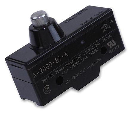 This is IP00 Snap Action Limit Switch Plunger NC/NO 500V manufactured by Omron. The manufacturer part number is A-20GD-B7-K. It has 250v maximum DC voltage. A bespoke product carries 500v of maximum AC voltage. Whereas, its mounting orientation is panel, side . The given dimensions of the product include 49.2 x 17.45 x 24.2 mm. It also carries 20 a maximum current. It is IP rated with ip00. Whereas, the minimum operating temperature of the product is -25°c. The normal state configuration includes nc/no. Its accurate length is 49.2mm. The terminal is a screw type. Furthermore, the product is 17.45mm wide. The product comes in 24.2mm depth. The product carries plunger actuator. It has typical contact type of snap action. Moreover, it has a minimum 1000000 operations mechanical life . It has spdt pole and throw configuration. It has a maximum operating temperature of +85°c. It allows screw connection type.